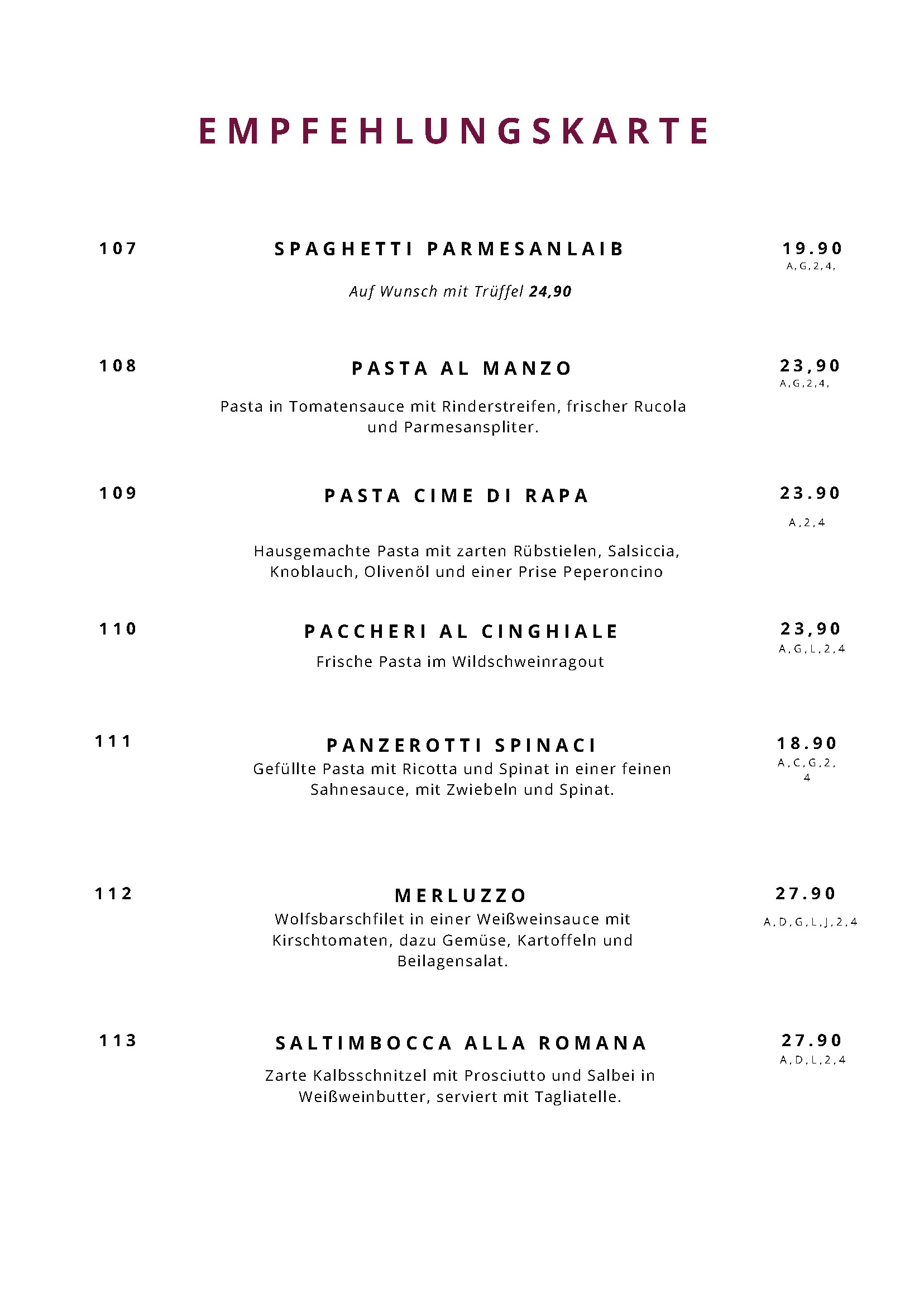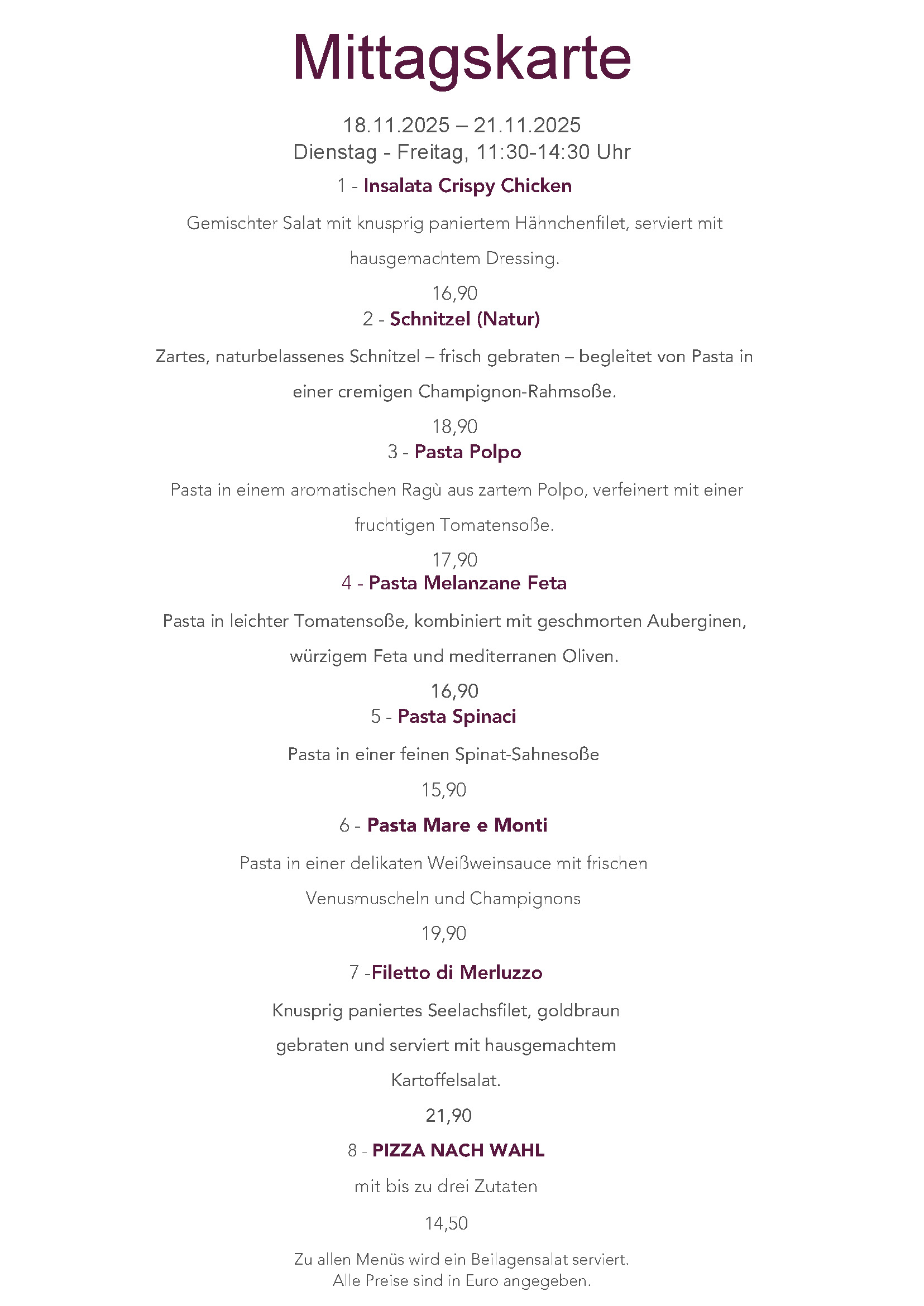 Sie erhalten die Mittags- und Empfehlungskarte wöchentlich per e-Mail zugeschickt. Bitte tragen Sie Ihre e-Mail Adresse ein.
